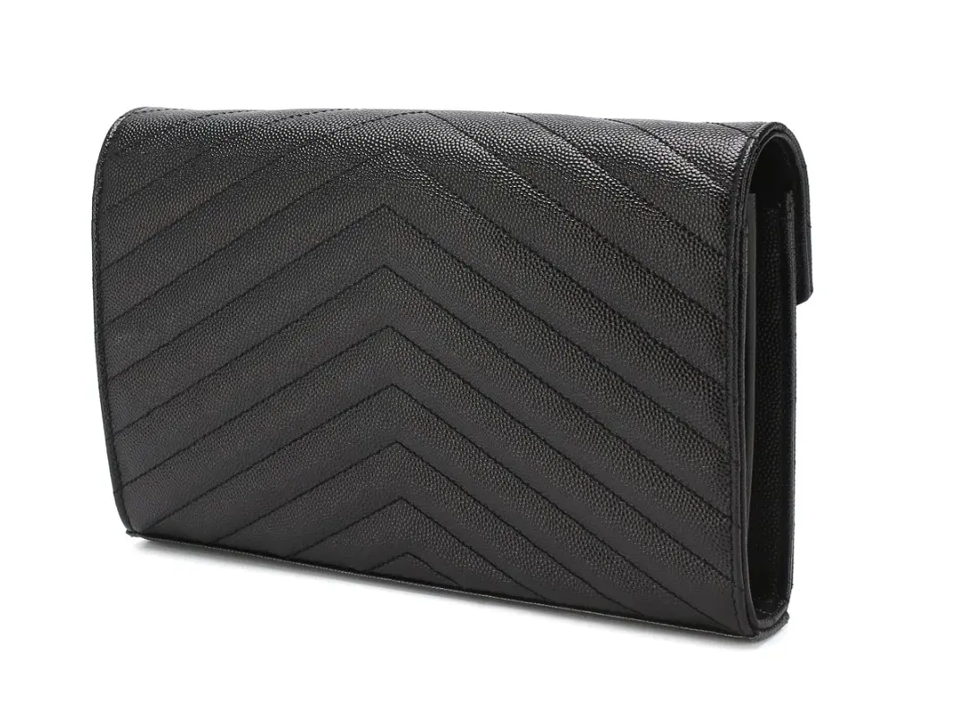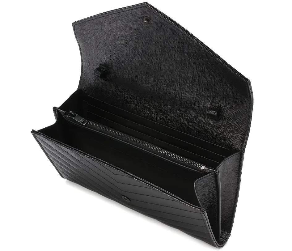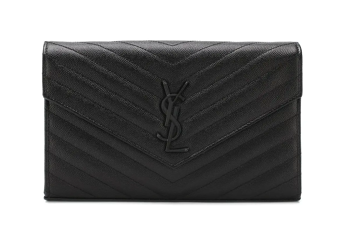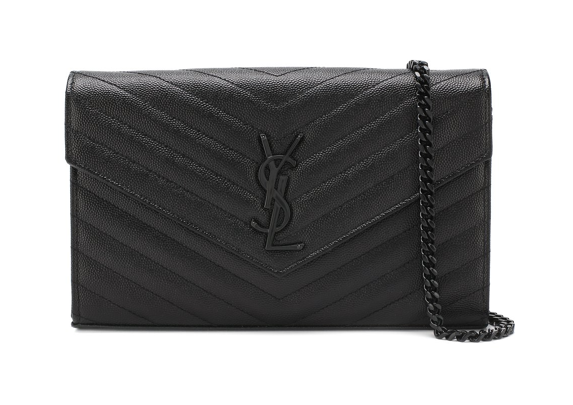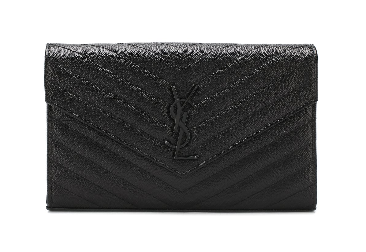 Черный клатч Monogram со съемным плечевым ремнем-цепочкой сшит из мелкозерненой матовой кожи со стеганным шевронным узором. Основное отделение с карманом на молнии и шестью слотами для банковских карт закрывается клапаном с металлической монограммой Кассандра, сложенной из инициалов Ива Сен-Лорана..