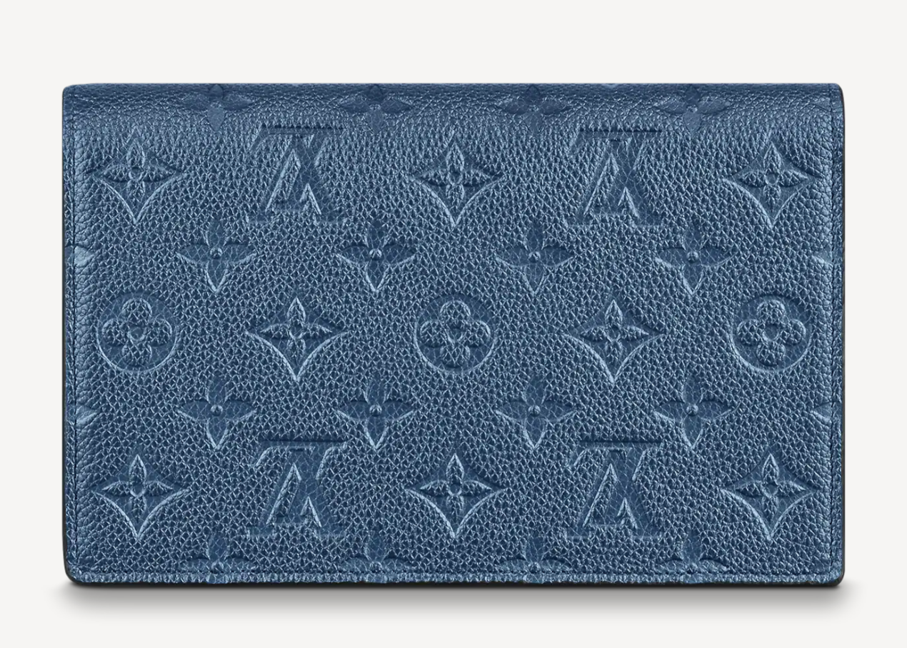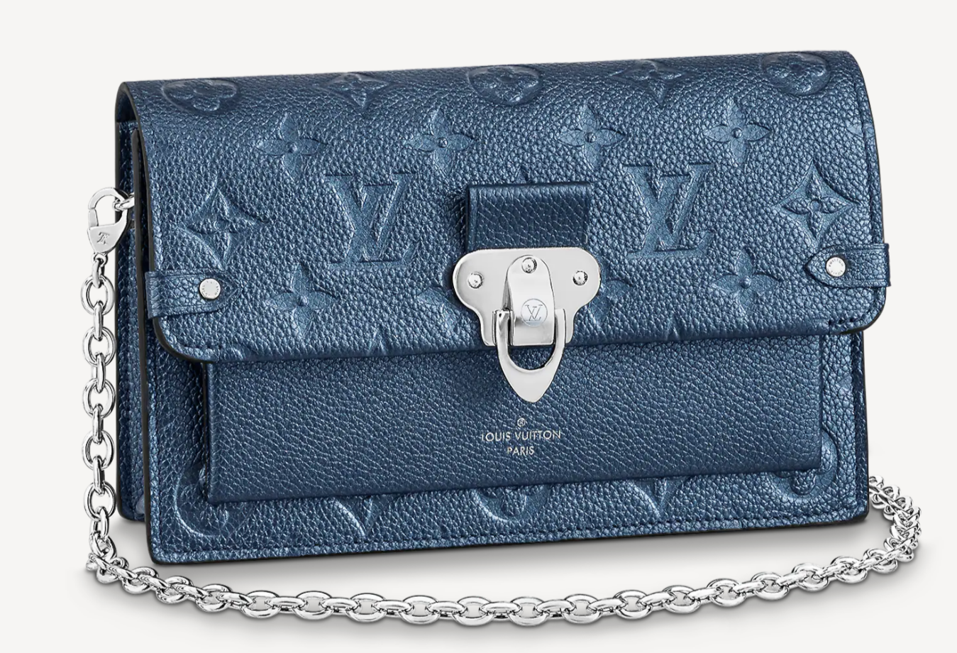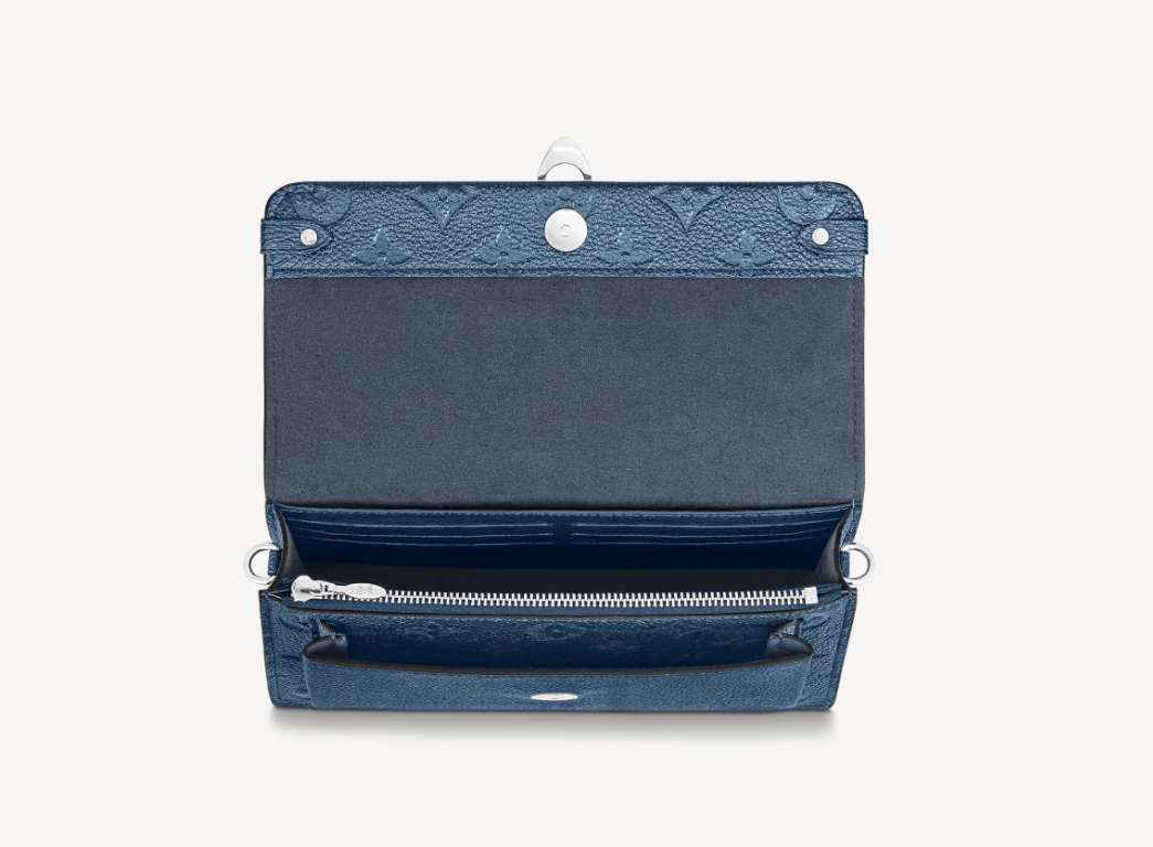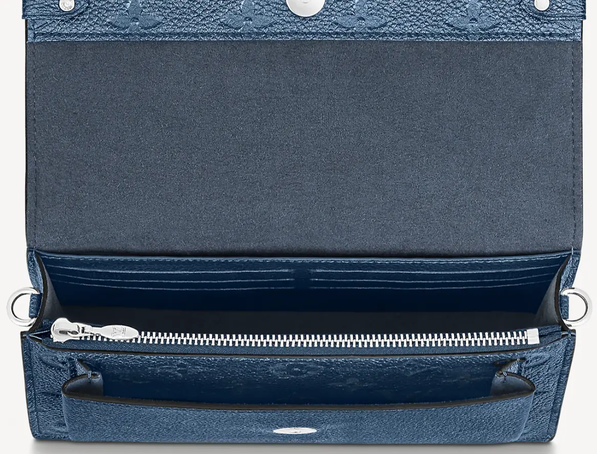 Тиснёный узор Monogram украшает кошелёк Vavin из синей яловой кожи с перламутровым эффектом. Вместительный карман идеален для смартфона, а многочисленные внутренние отделения — для банковских карт, монет и других важных мелочей. Съёмная цепочка позволяет носить изящный аксессуар на плече.