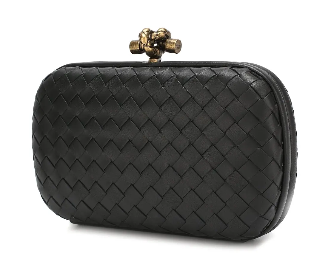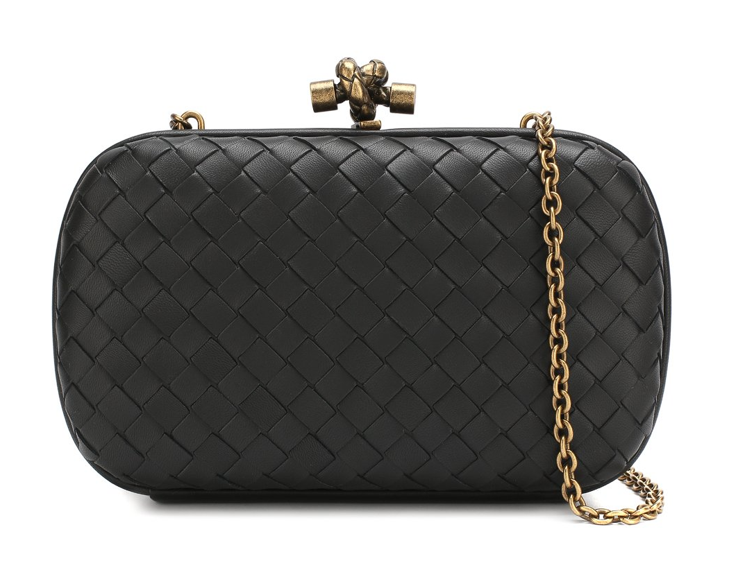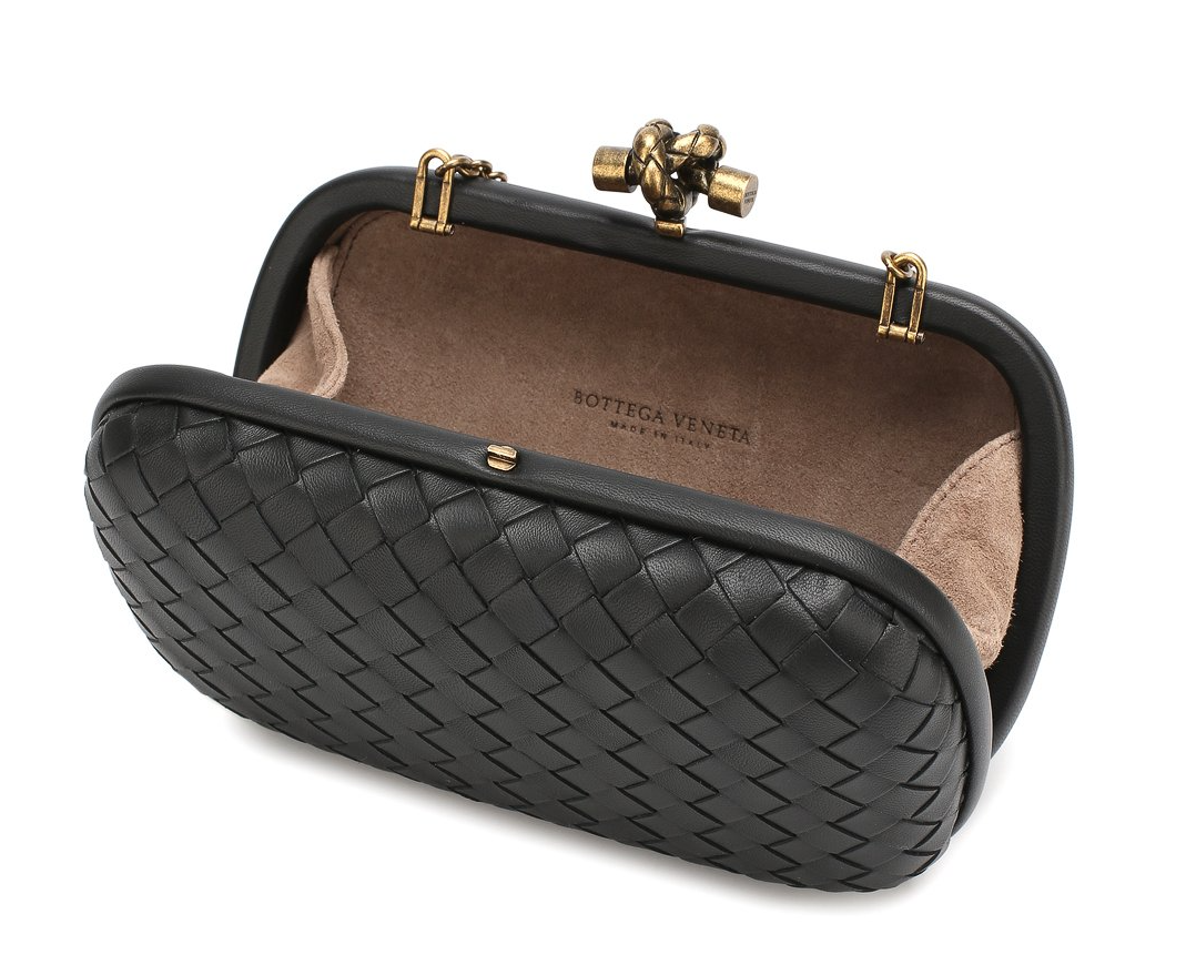 Знаковый для марки черный клатч Chain Knot с плечевым ремнем-цепочкой вошел в коллекцию сезона весна-лето 2019 года. Мастера бренда изготовили аксессуар из мягкой кожи наппа в старинной технике плетения intrecciato. Замок-защелка цвета античного золота традиционно выполнен в форме узла. Внутрь поместятся помада, кардхолдер и ключи.